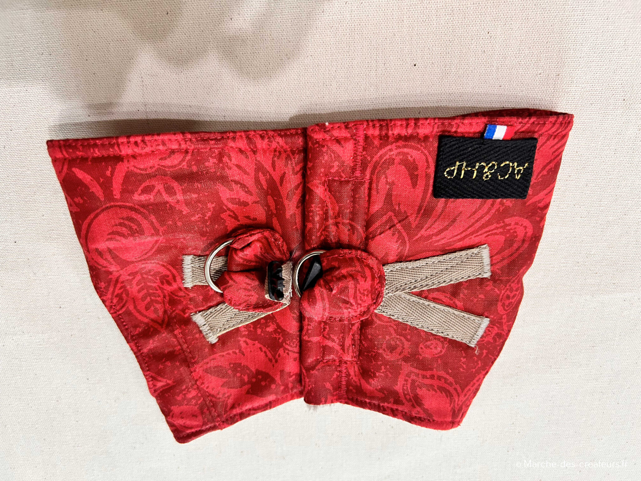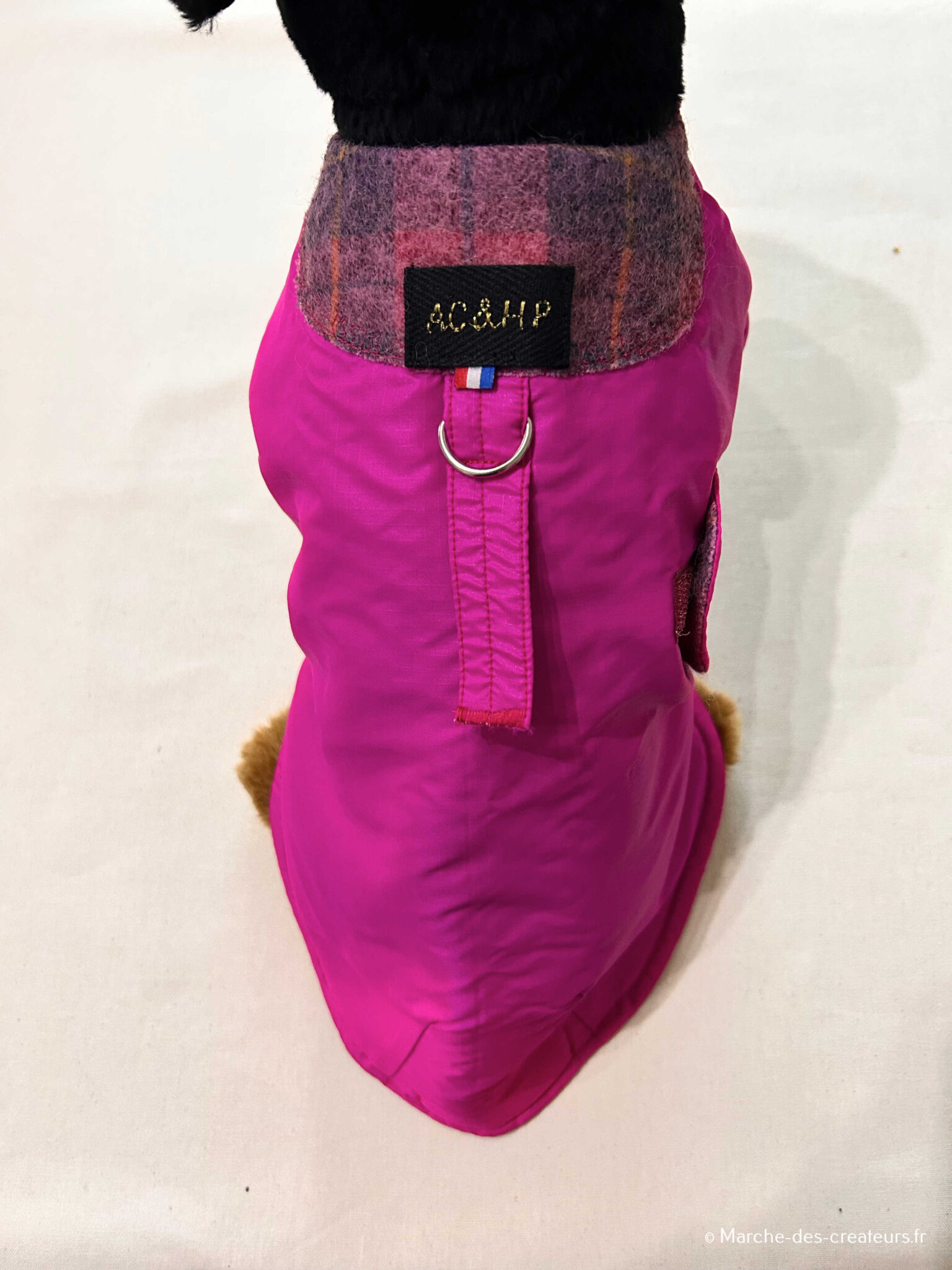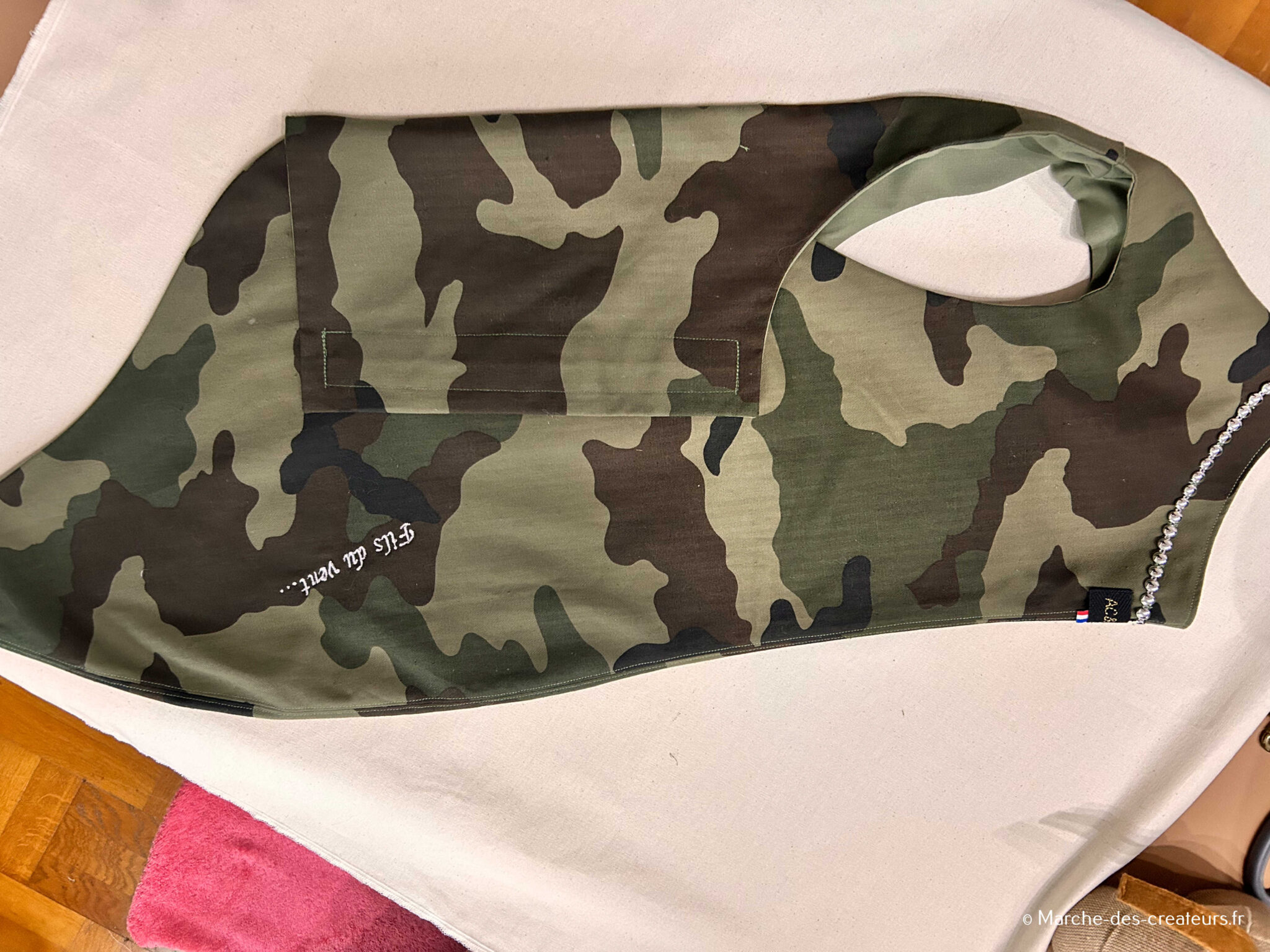 Dans mon atelier à domicile, je fabrique des vêtements et accessoires pour chiens : manteaux, harnais, snoods, bandanas et plaids. Chaque modèle est fait main, avec des matières de qualité et un vrai souci du détail. Je réalise également des créations sur mesure, adaptées à la morphologie et aux besoins de chaque chien.