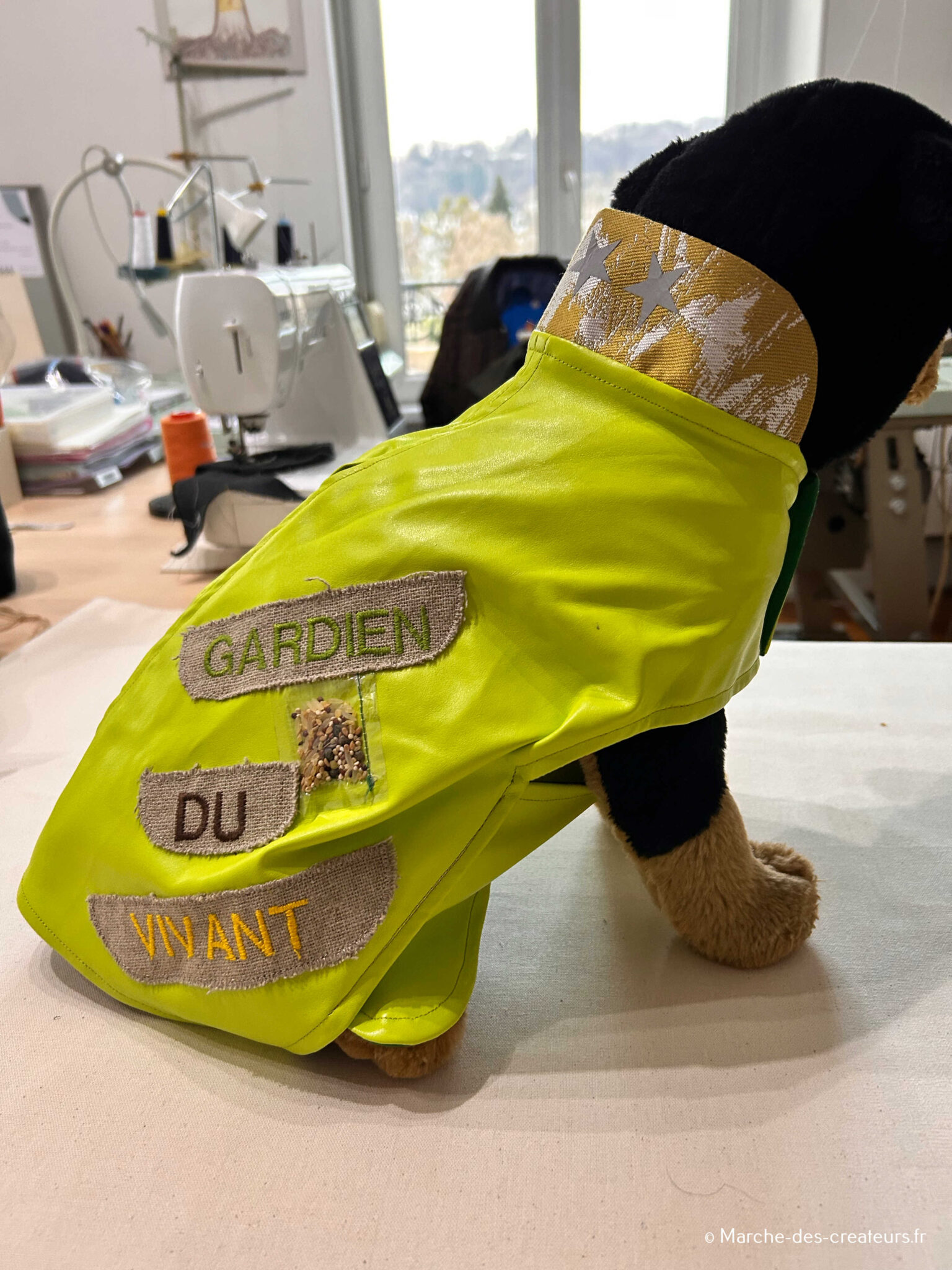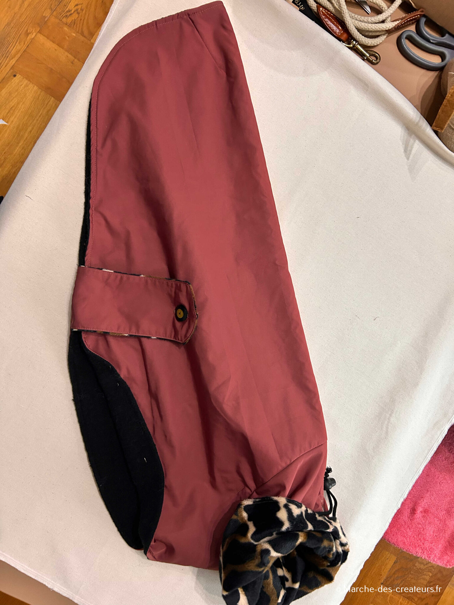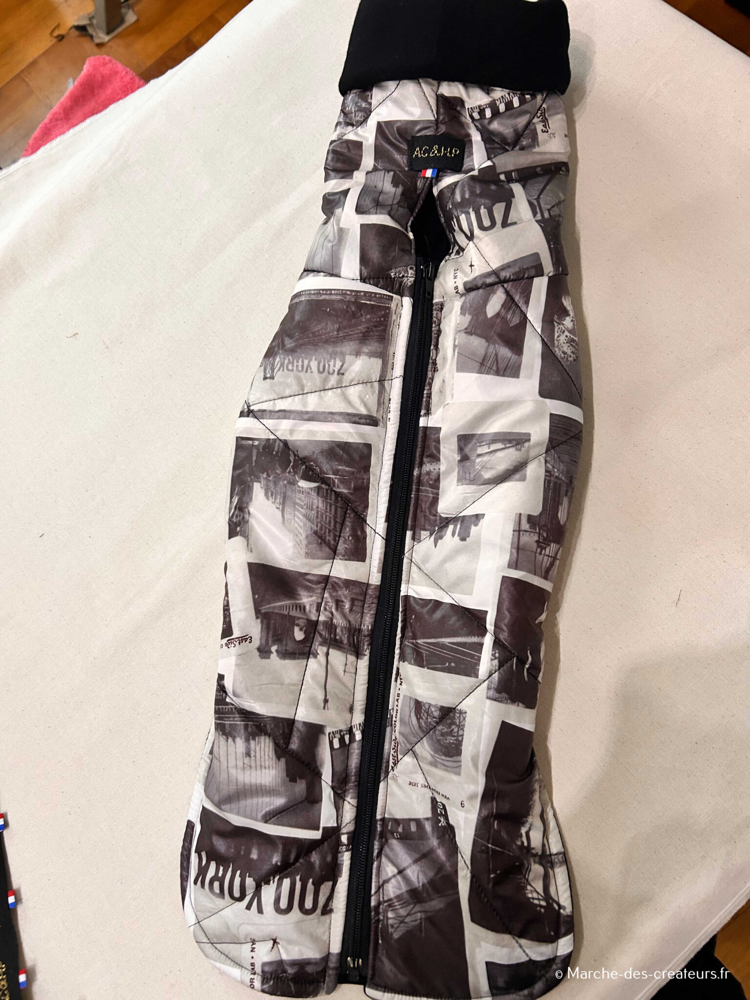 Dans mon atelier à domicile, je fabrique des vêtements et accessoires pour chiens : manteaux, harnais, snoods, bandanas et plaids. Chaque modèle est fait main, avec des matières de qualité et un vrai souci du détail. Je réalise également des créations sur mesure, adaptées à la morphologie et aux besoins de chaque chien.