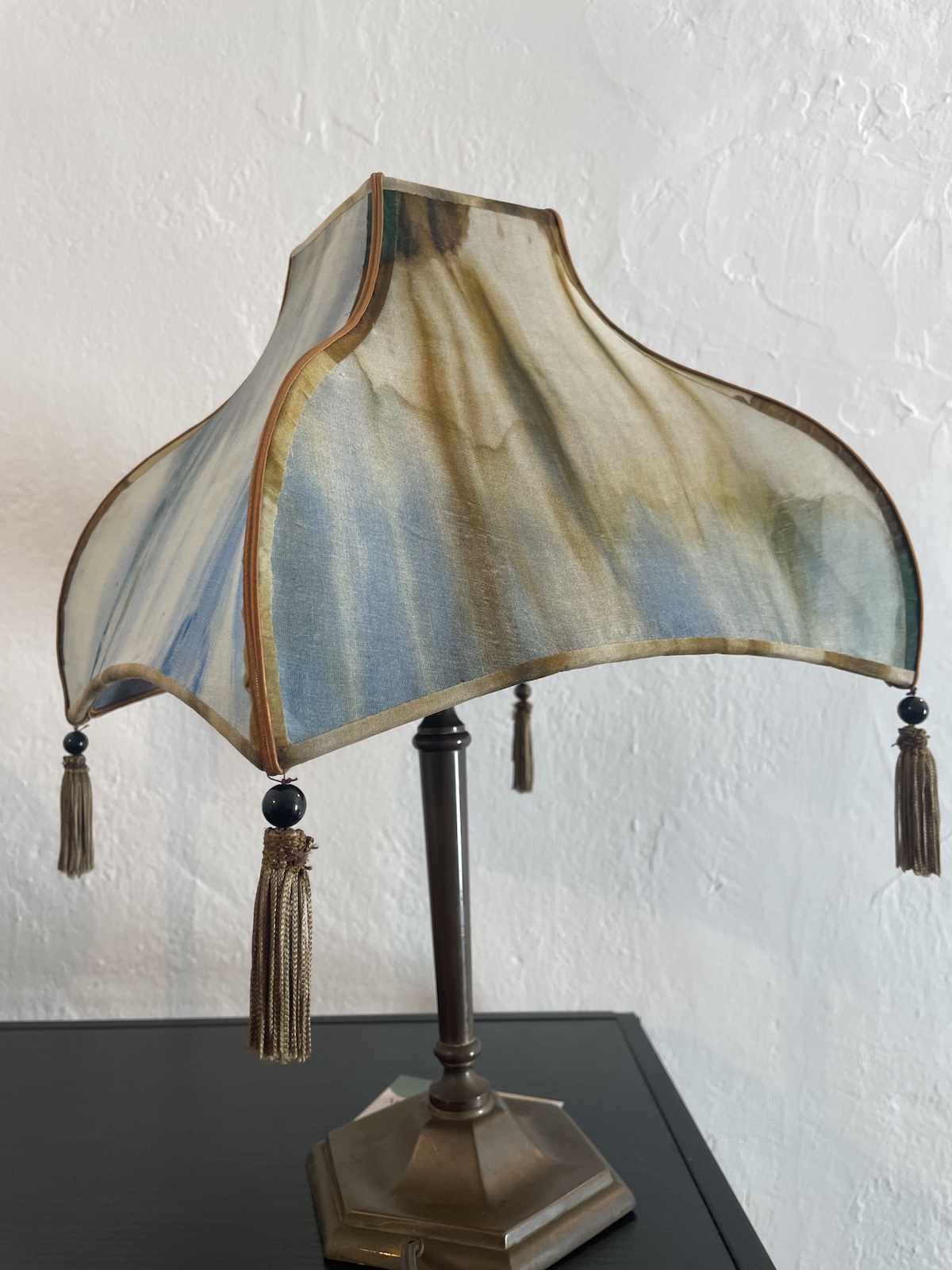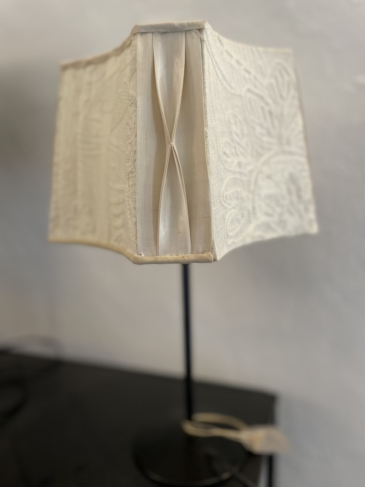 Depuis plusieurs années, c’est vers la lumière que s’oriente mon travail, avec la fabrication d’abat-jour originaux, en utilisant toujours de beaux textiles d’éditeur, passementeries, qui s’accorderont avec les pieds de lampe chinés, retrouvés ou pour transformer des luminaires