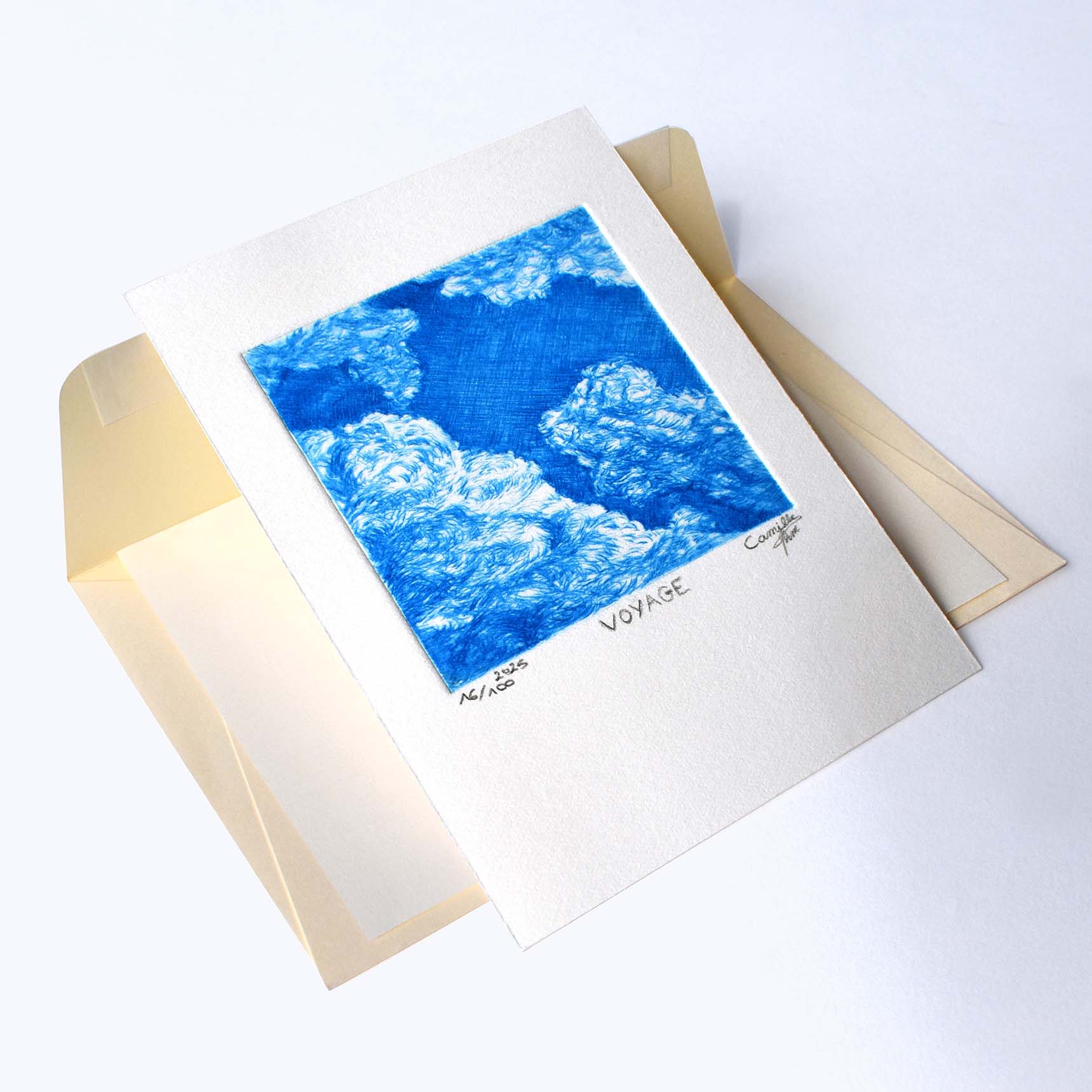 Je diversifie la gamme de mes produits en proposant des packs papeterie (ce sont des tirages originaux que l’on peut faire voyager en les envoyant à un être cher), des bijoux comportant une petite gravure ainsi que des tirages classiques encadrés.
