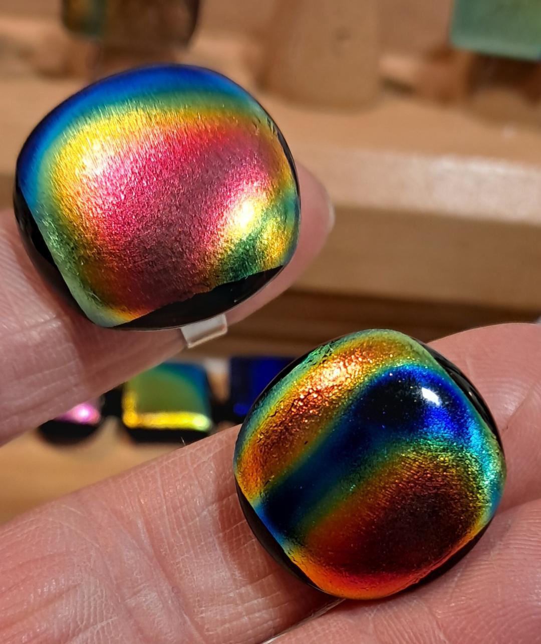 J’aime particulièrement intégrer de petits fragments de verre dichroïque, aux reflets métalliques et lumineux, qui captent la lumière et font vibrer chaque création.