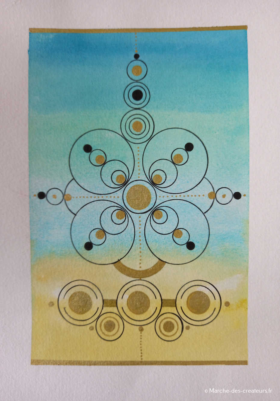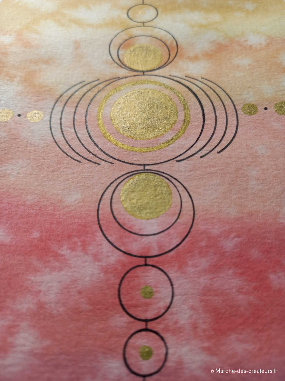 Leur forme ronde et leur expansion qui pourrait continuer à l’infini, auxquels s’ajoute la couleur du fond peint à l’aquarelle, font de ces dessins des oeuvres hautement vibratoires qui rayonnent une beauté, un équilibre, une force qui nous nourrit et nous soigne.