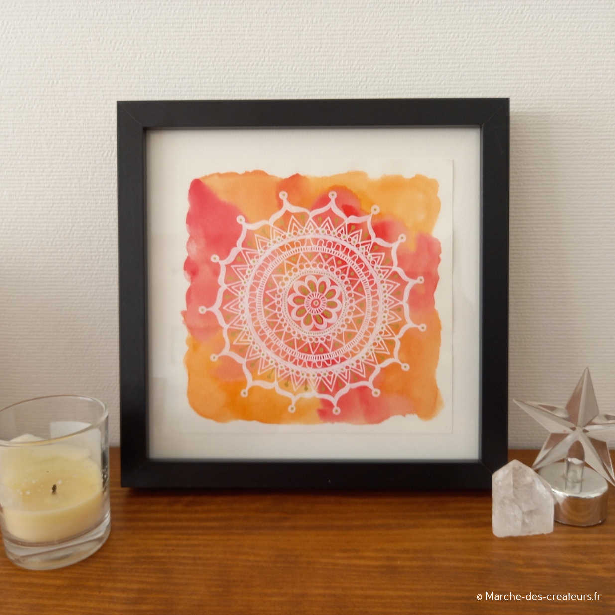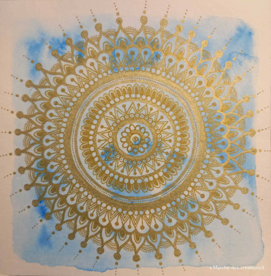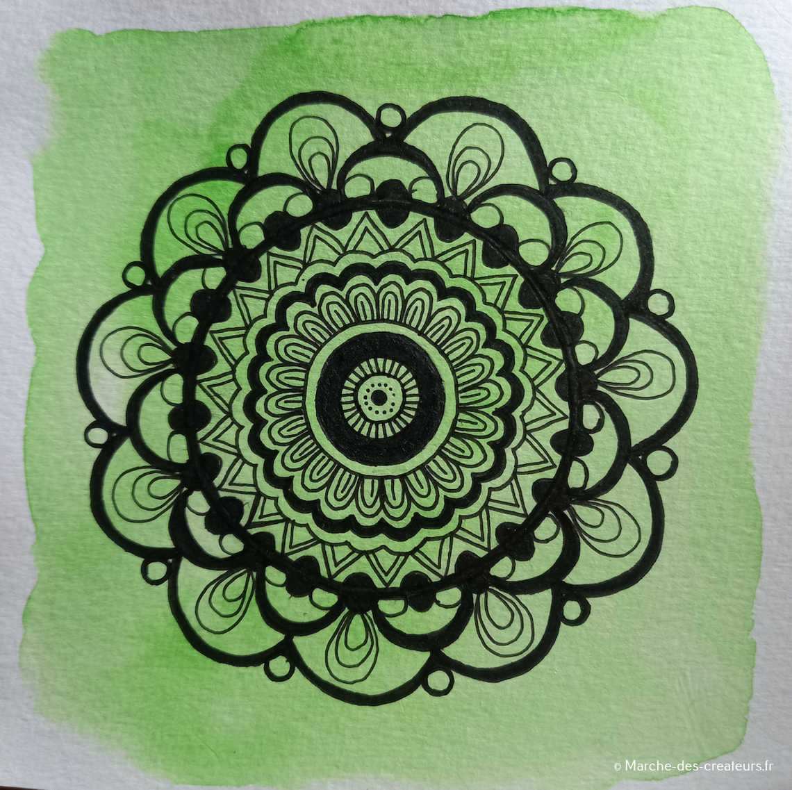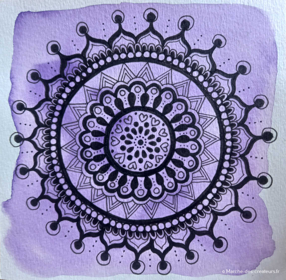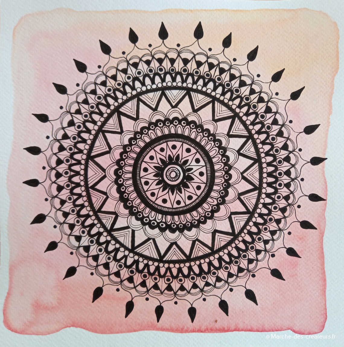 Je dessine majoritairement des mandalas ; j’adore les dessiner, découvrir le rendu petit à petit au fur et à mesure que les cercles se forment et admirer le rendu final toujours surprenant. Le mot « mandala » vient du Sanskrit, le langage sacré de l’Inde, et veut dire « cercle sacré » ; c’est dans cette énergie que je me mets quand je dessine ces mandalas.