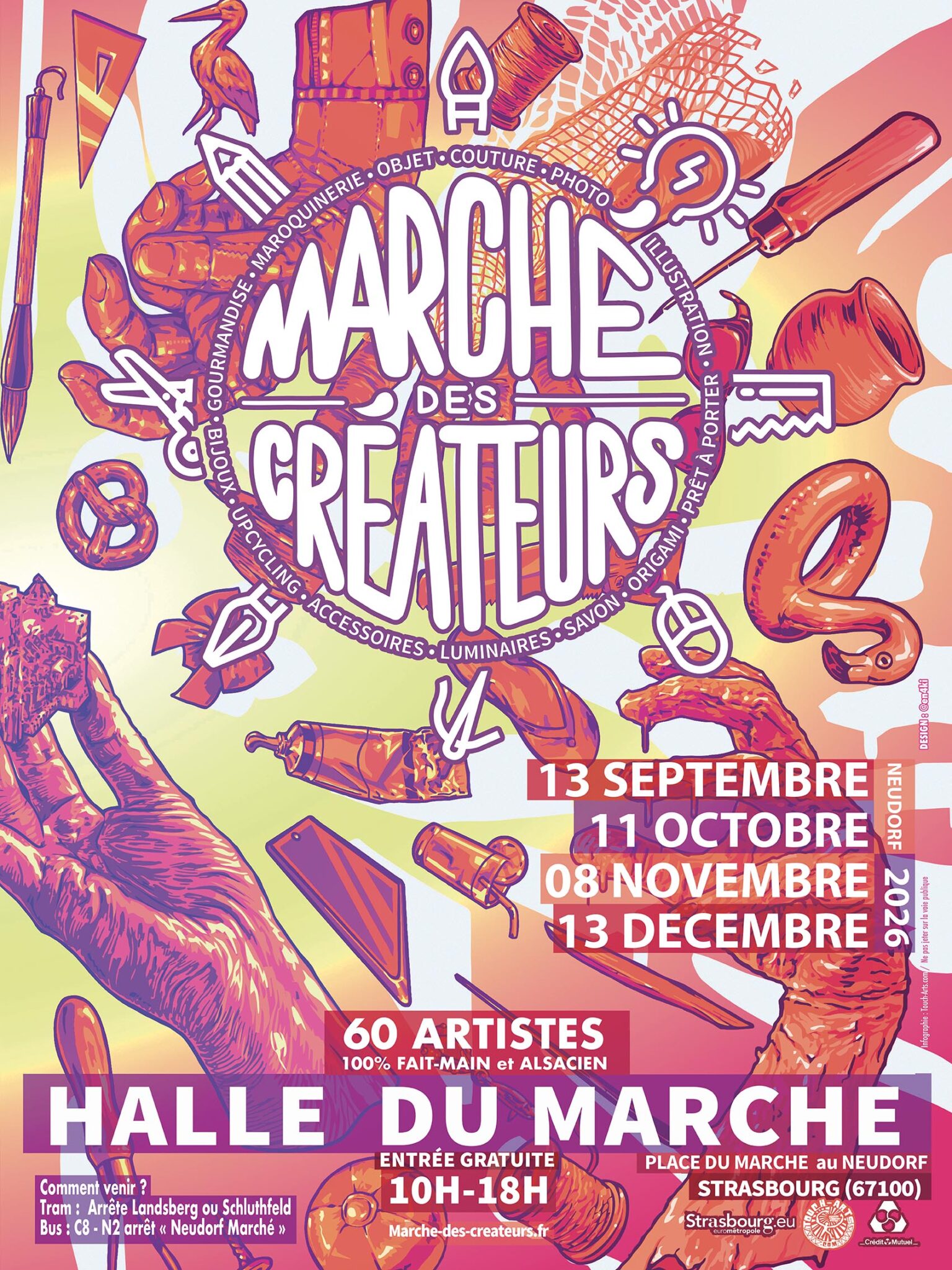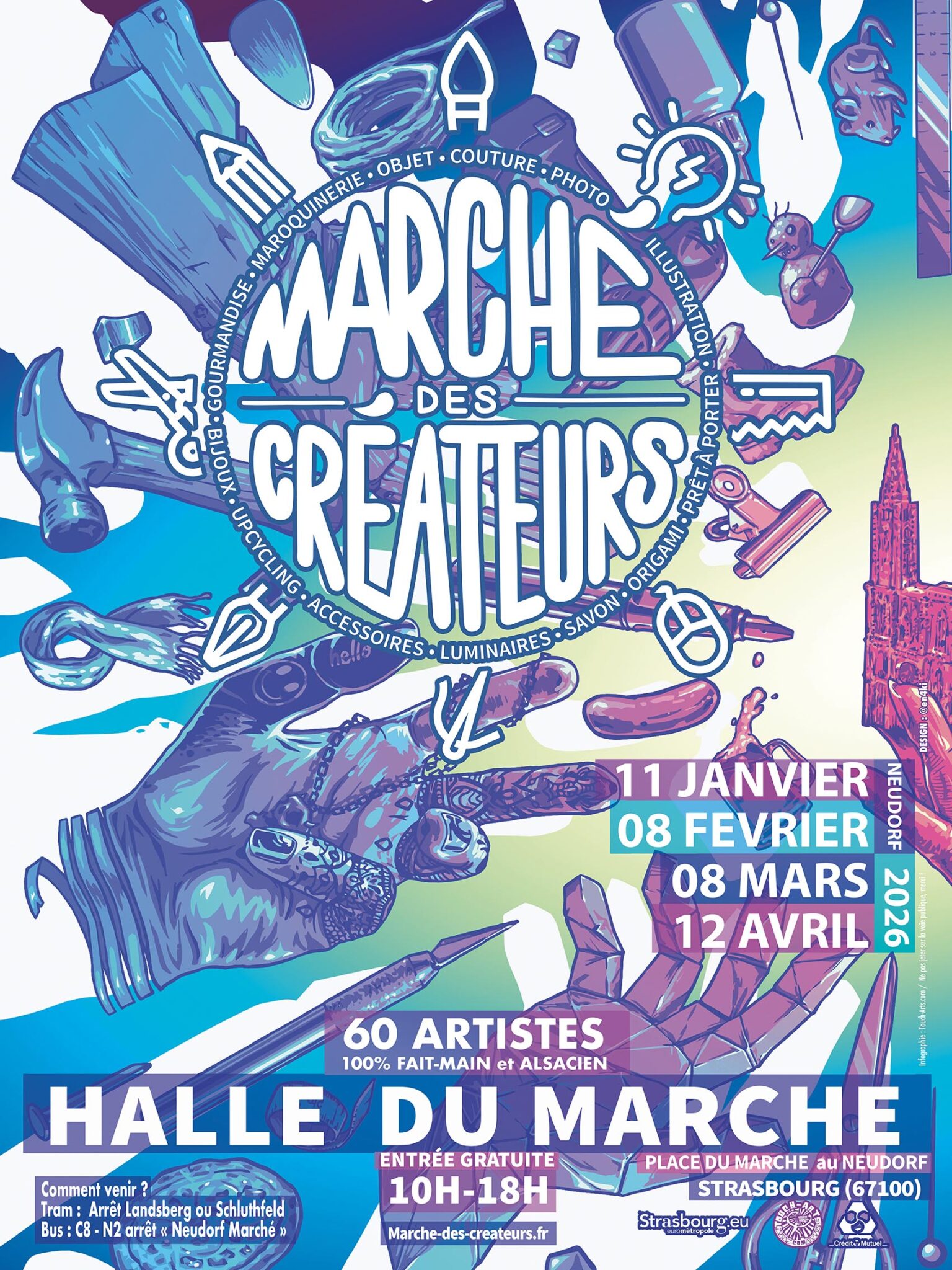 E : J’ai fait une version hiver et une été : luge, bonhommes de neige pour la première, bouées et verre à cocktail pour l’autre – entre autres détails ! J’ai bien sûr fait l’honneur à l’Alsace, avec des bretzels, bières ou cigogne ! Evidemment, j’ai matérialisé différents corps de métier, représentant la diversité des arts présents sur les marchés des créateurs à travers des mains, outil principal des artisans : la couture avec des bobines de fil, la poterie, le bricolage avec une scie, l’artiste avec un crayon. Cette affiche est pleine de détails et mérite de s’arrêter dessus pour y déceler les différentes références !