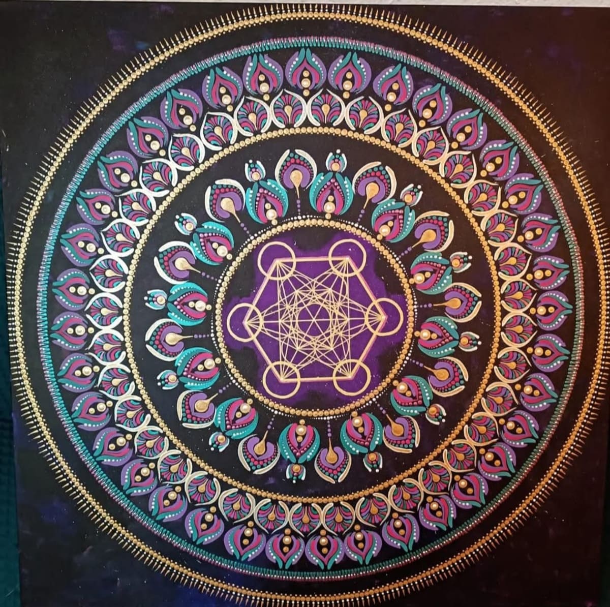 Je réalise intuitivement des peintures à caractère méditative autant pour moi que pour la personne qui le contemple. Le mandala signifie cercle en sanskrit et représente des dessins géométriques et symétriques par rapport à son centre.