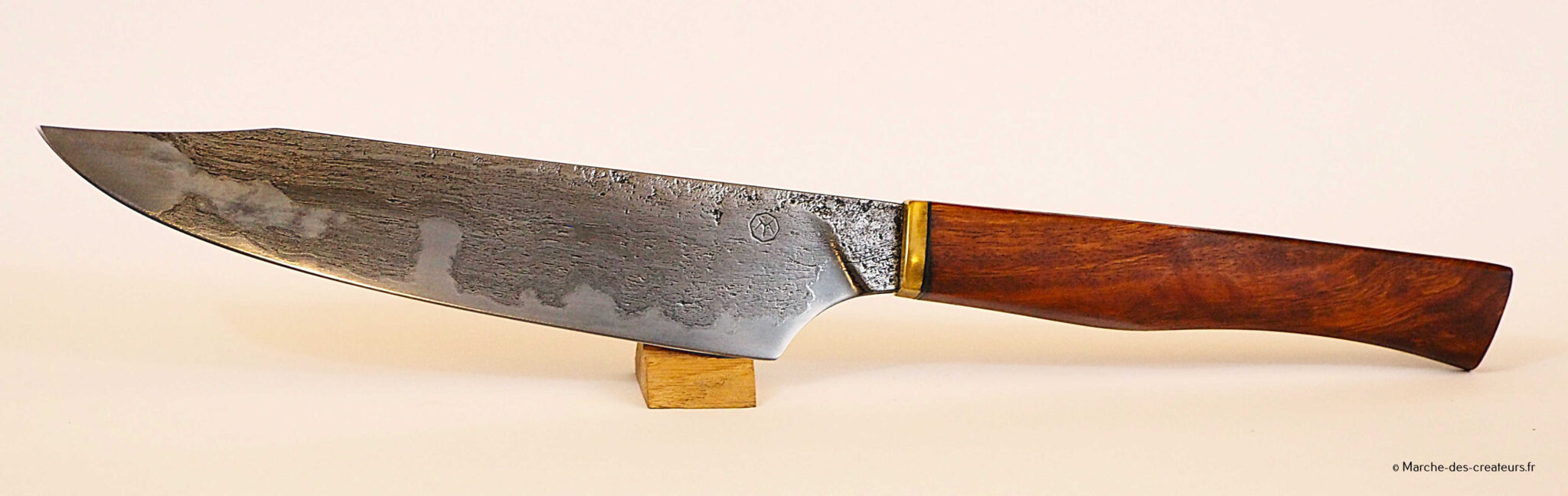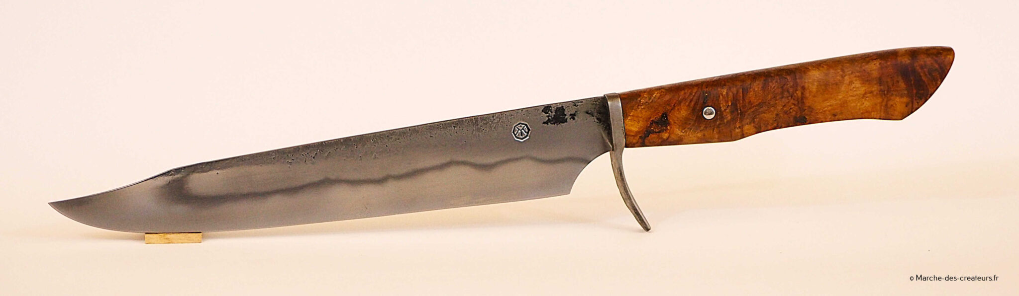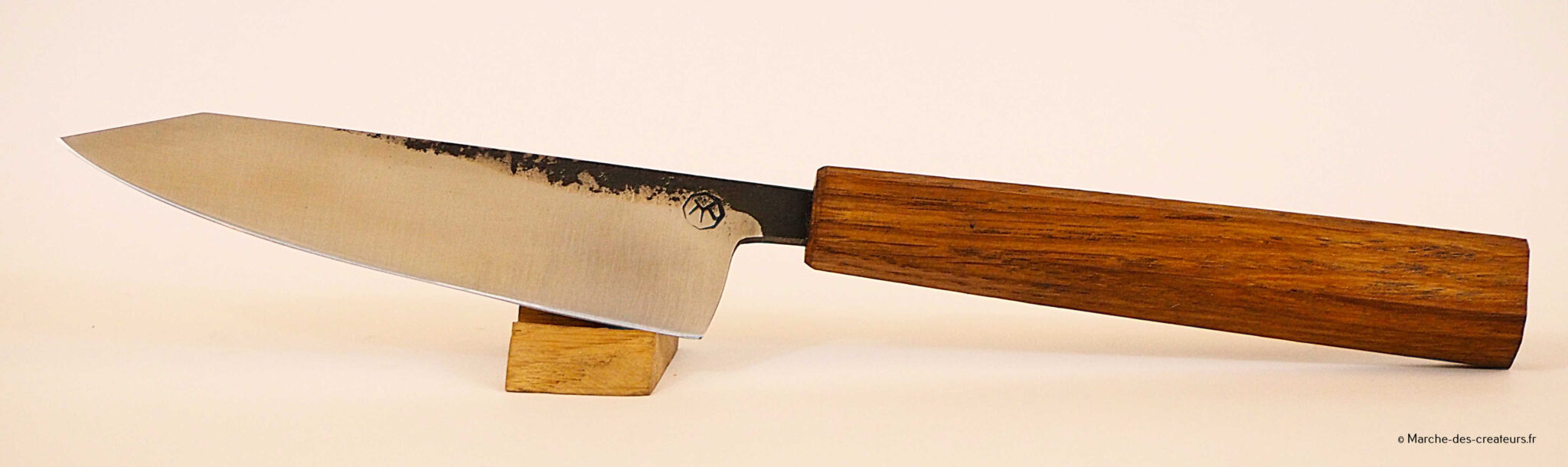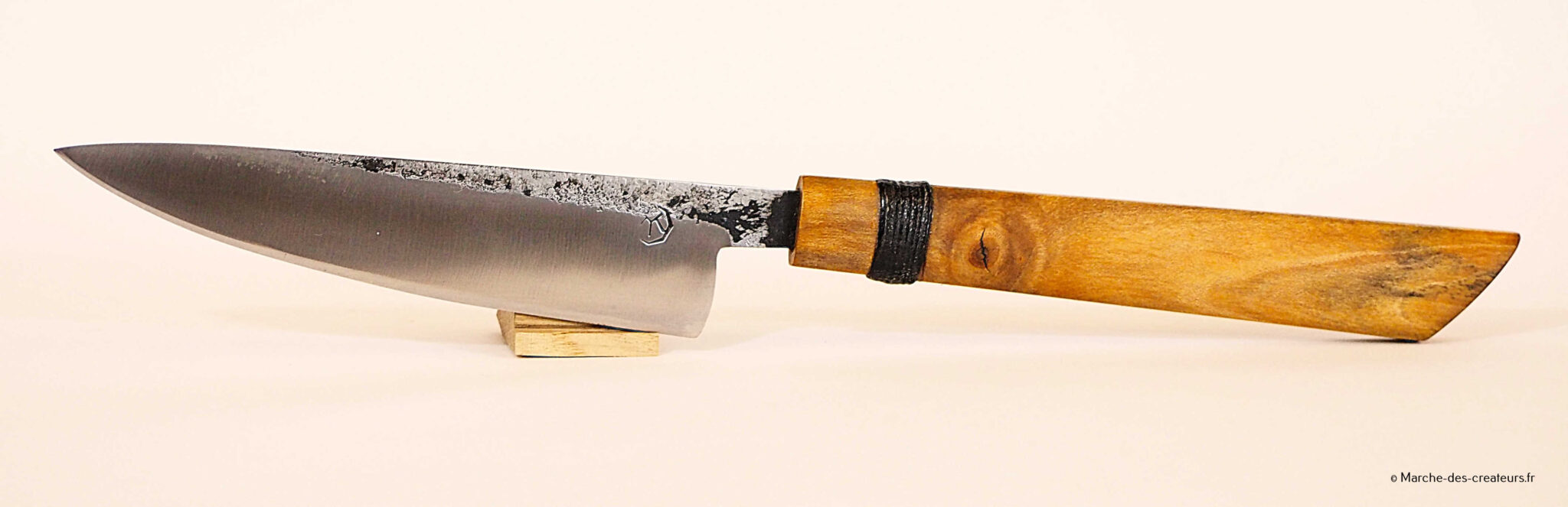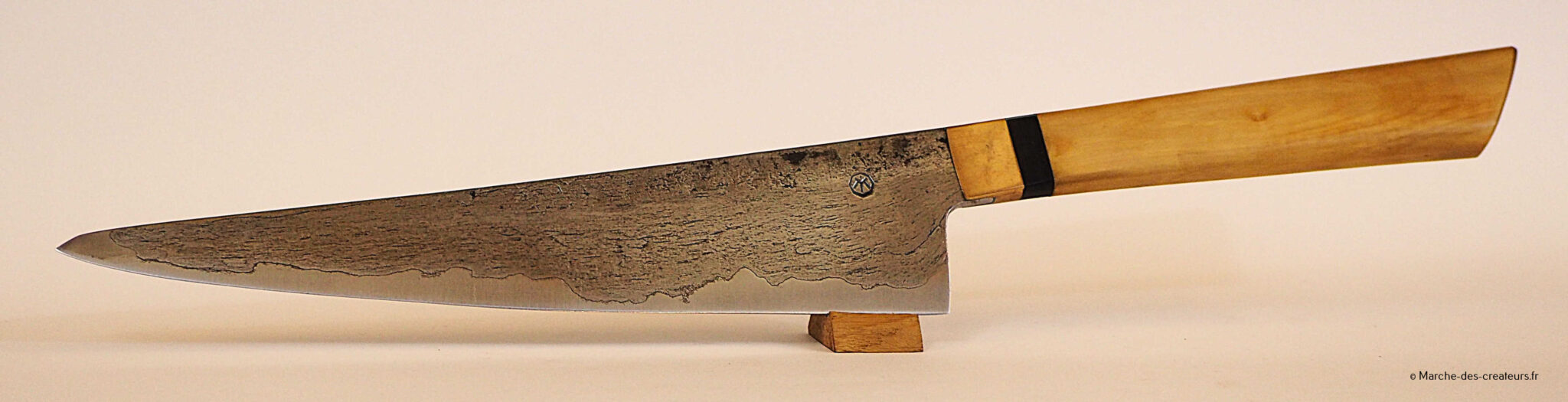 Je créé majoritairement des couteaux de cuisine, dans un style japonisant, avec des techniques japonaises. Je réalise moi-même mes aciers feuilletés (communément appelé acier damas), entre 100 et 2000 couches.