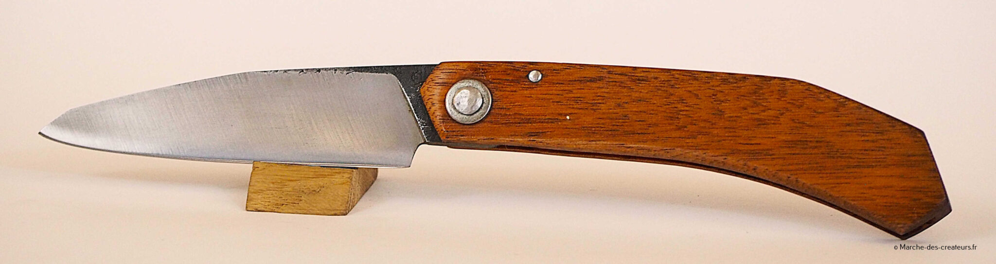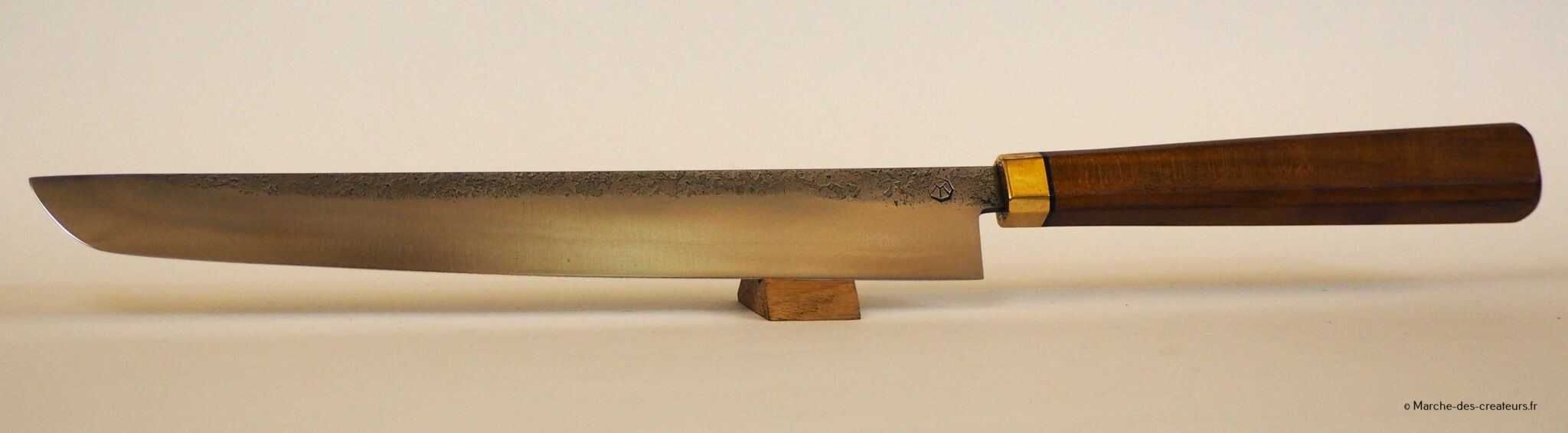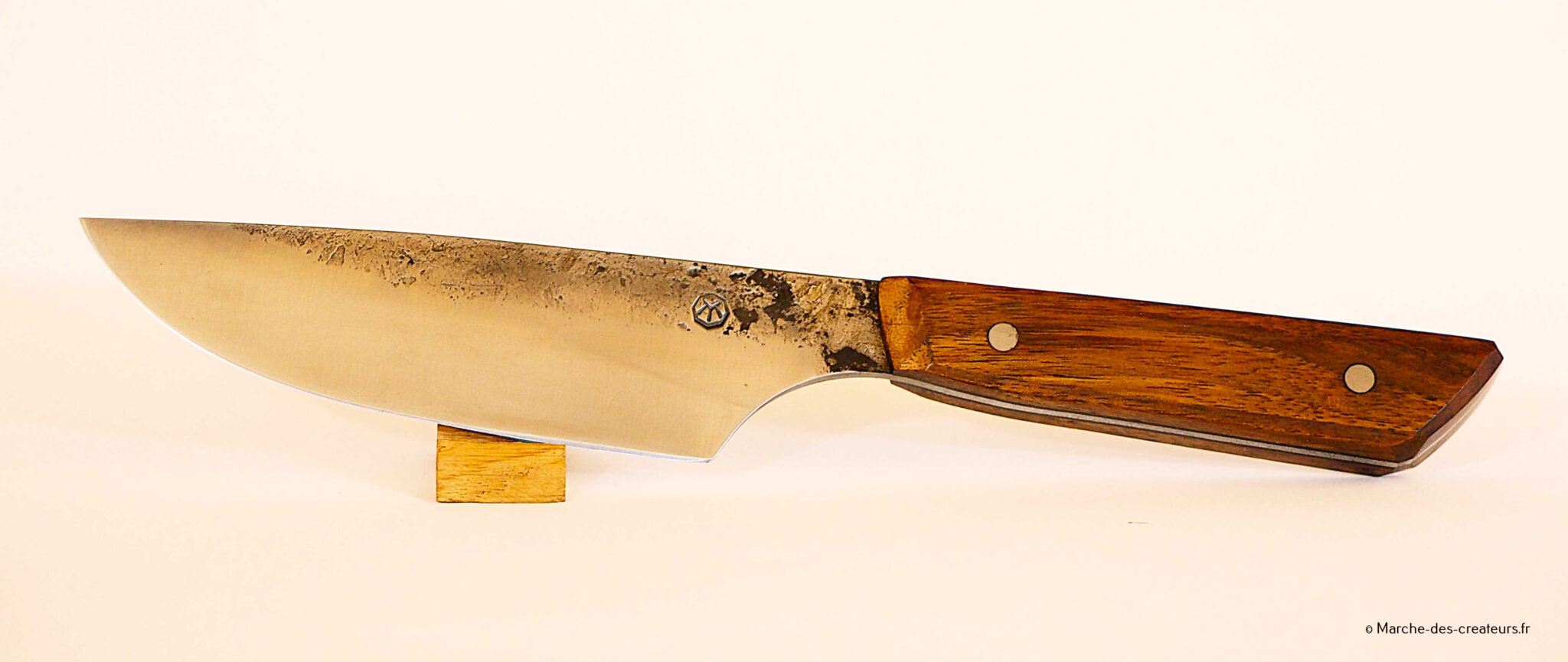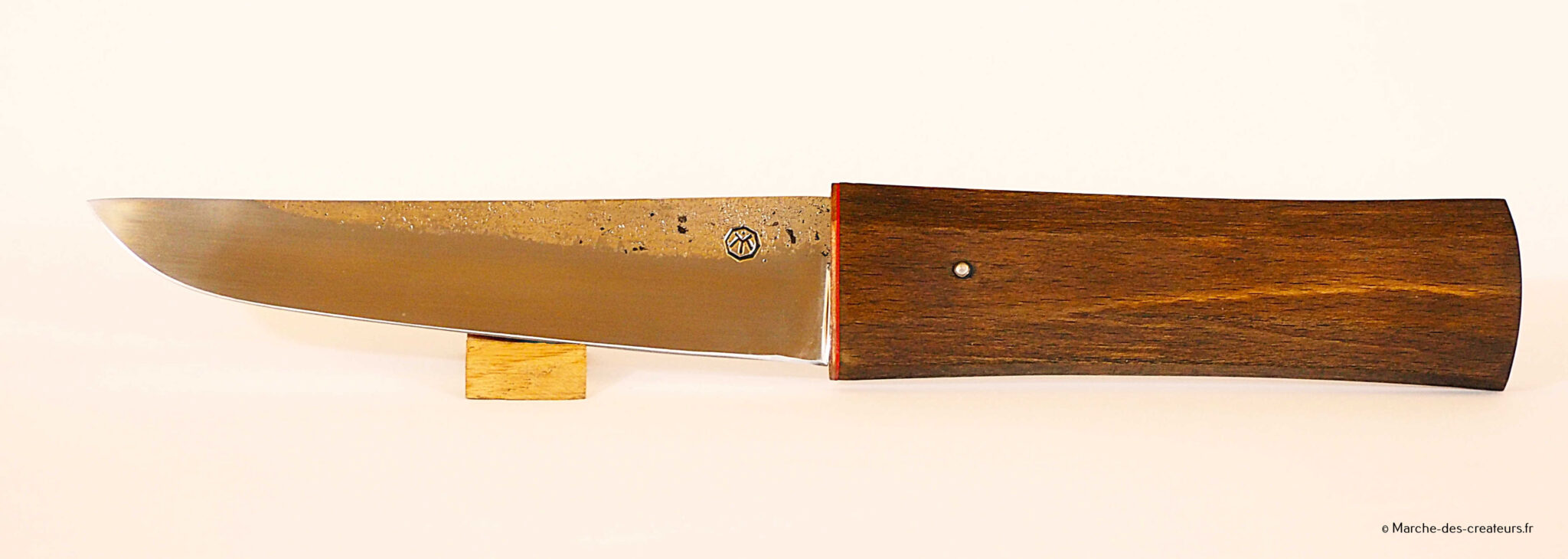 Je créé majoritairement des couteaux de cuisine, dans un style japonisant, avec des techniques japonaises. Je réalise moi-même mes aciers feuilletés (communément appelé acier damas), entre 100 et 2000 couches.