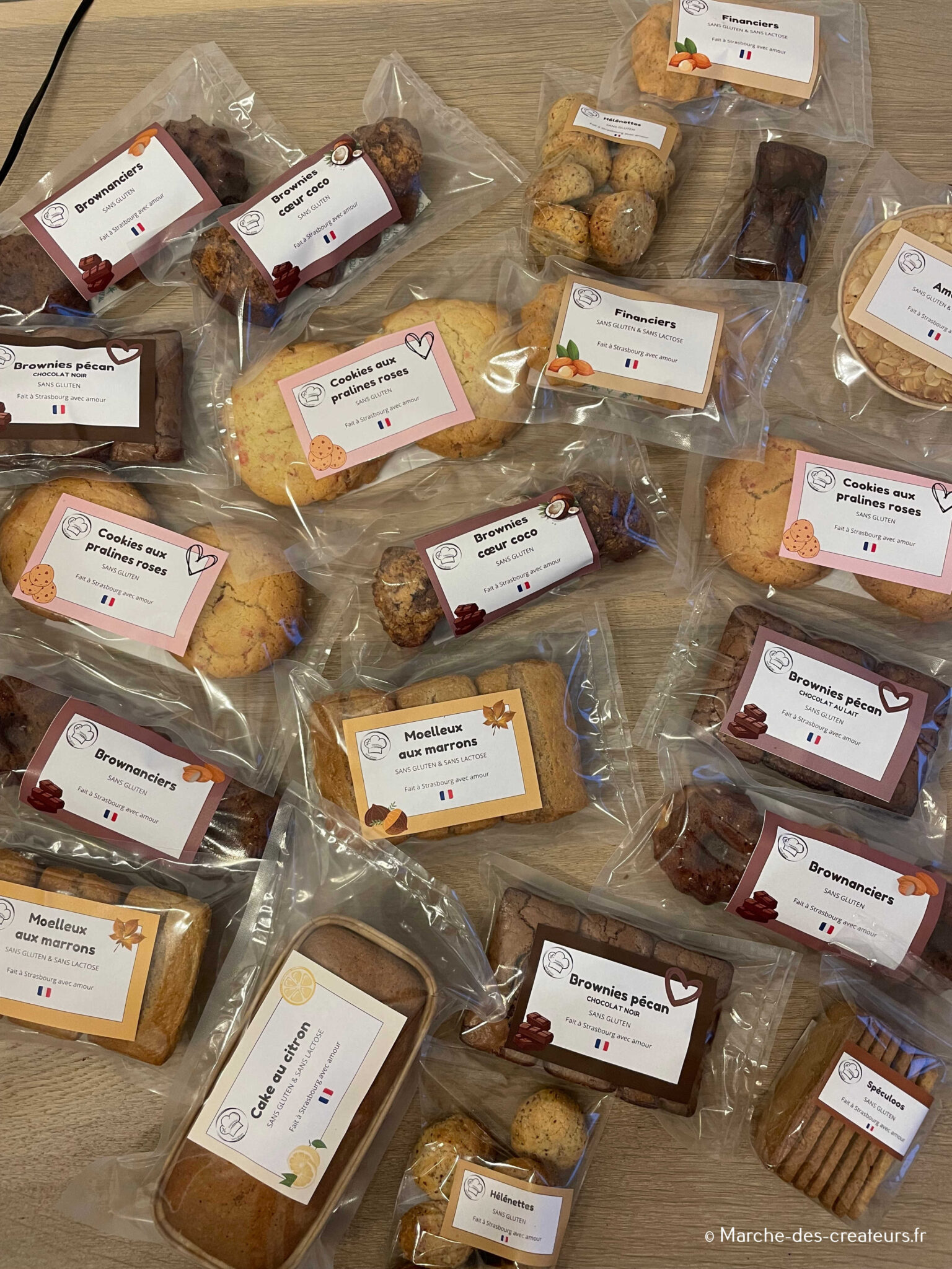 Je propose une gamme de produits secs : bronwies, cookies, pâte à tartiner, muesli … et une gamme de produits frais : tartes, number cake, Paris-Brest. Je fais également des gâteaux personnalisés pour les anniversaire, baptêmes, mariage, …