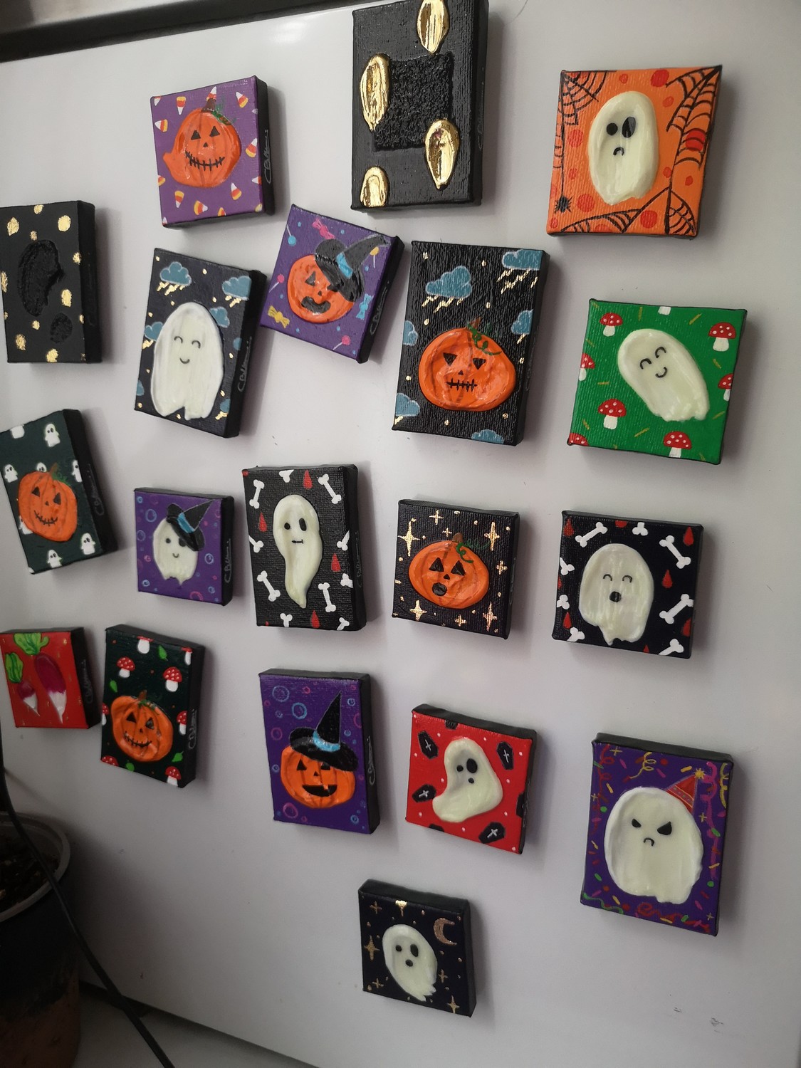 Je travaille principalement 2 formats: les tableaux sur toiles classiques et des mini toiles de 5 ou 7cm que je décline sous forme de magnets pour frigo.